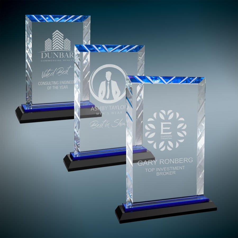 Premier Crystal is the ultimate way to recognize and honor. Premier Accent Glass is individually boxed and mounted on a black or blue glass base. They come in 3 sizes: 7, 8 and 9 inches.