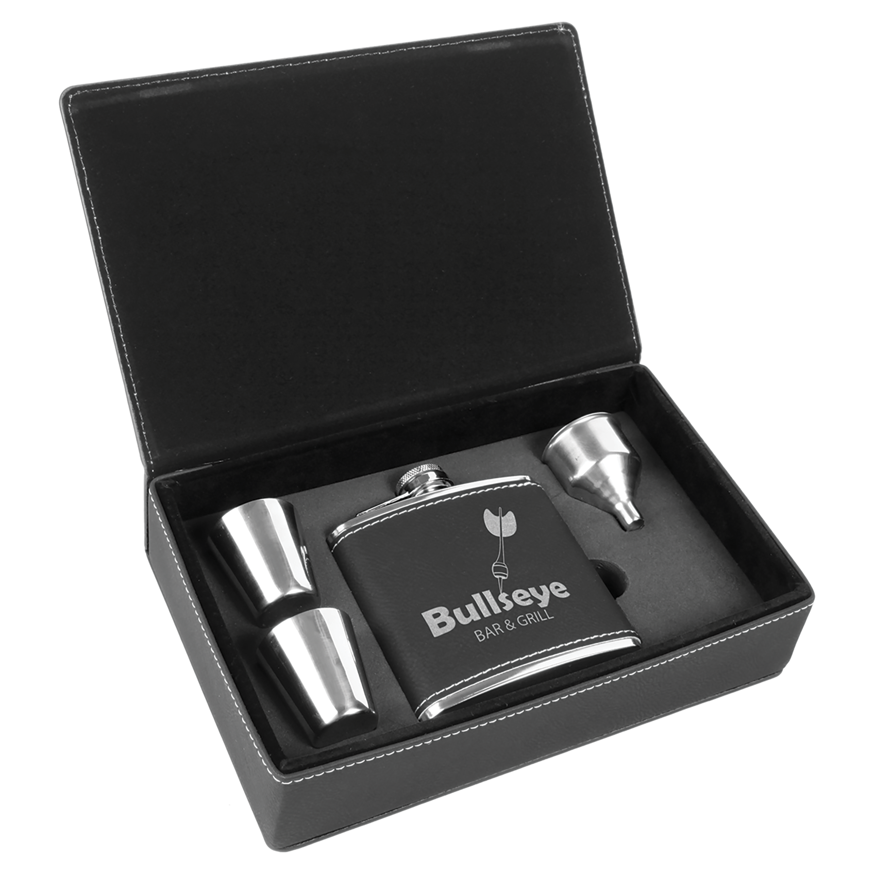 6 oz. Black/Silver Laserable Leatherette Flask Gift Set
