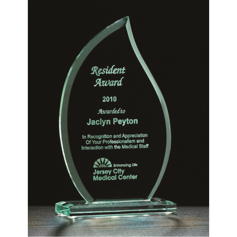 Flame Glass Award, 1/2" thick jade glass suitable for laser engraving or sandblasting. These Glass Awards are packaged in satin-lined, padded gift boxes. All Glass Awards bases have protective rubber feet.