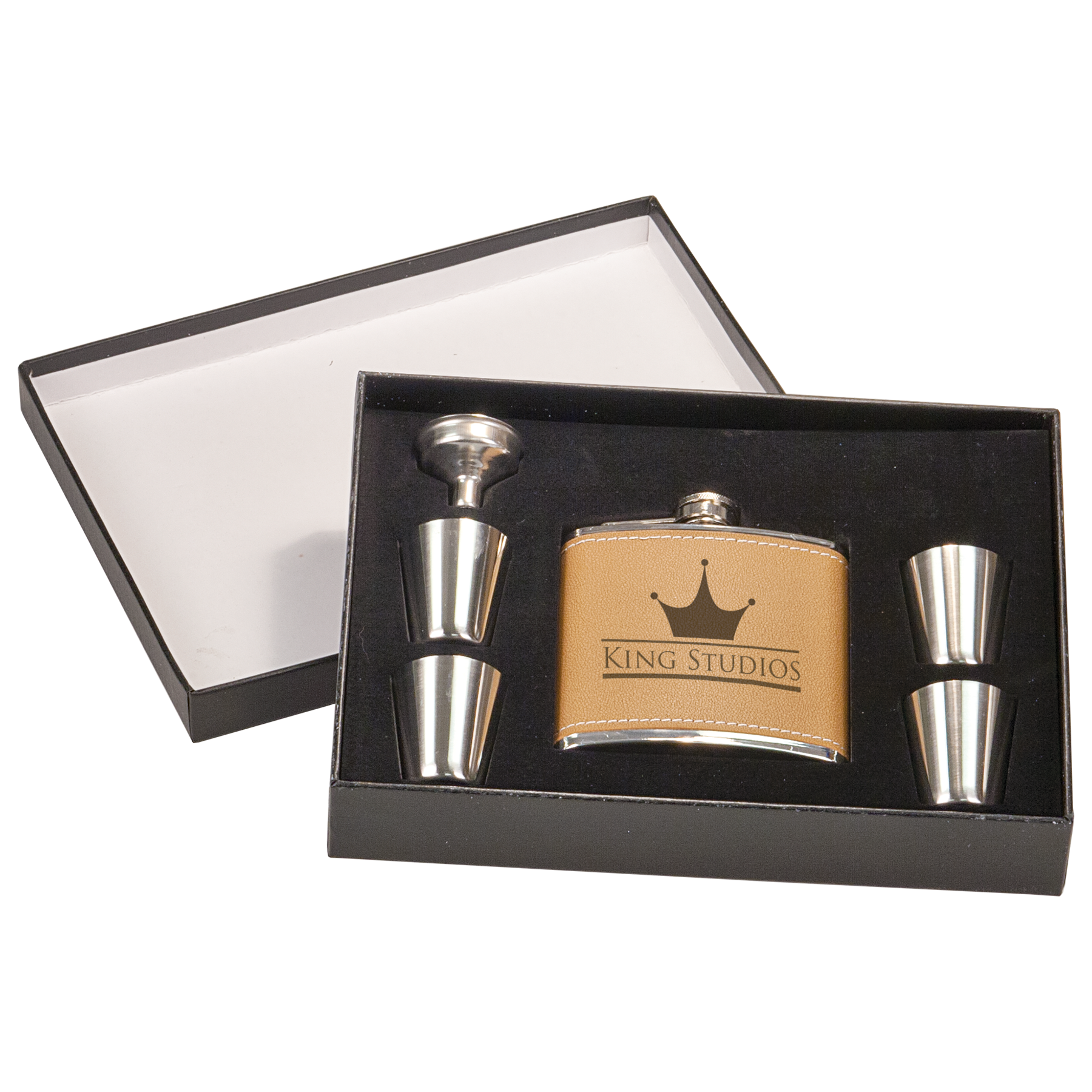 Our Laser Engravable Flask Set with Shot Glasses is the perfect canvas for any special occasion. The 6 oz Leatherette flask comes with four shot glasses and a funnel for easy filling. They will appreciate your personal touch that is expertly laser engraved for a permanent mark that will never wear away or wash off. The set also features a durable black lid box for safe keeping.
