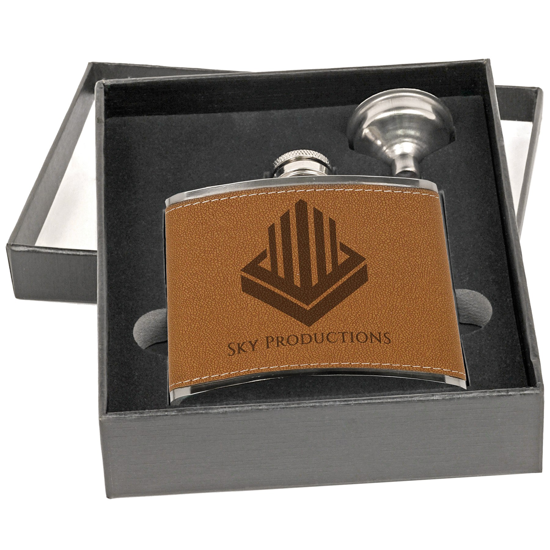 Our Laser Engravable Flask Set with funnel is the perfect canvas for any special occasion. The 6 oz Leatherette flask comes with a funnel for easy filling. They will appreciate your personal touch that is expertly laser engraved for a permanent mark that will never wear away or wash off. The set also features a durable black lid box for safe keeping.