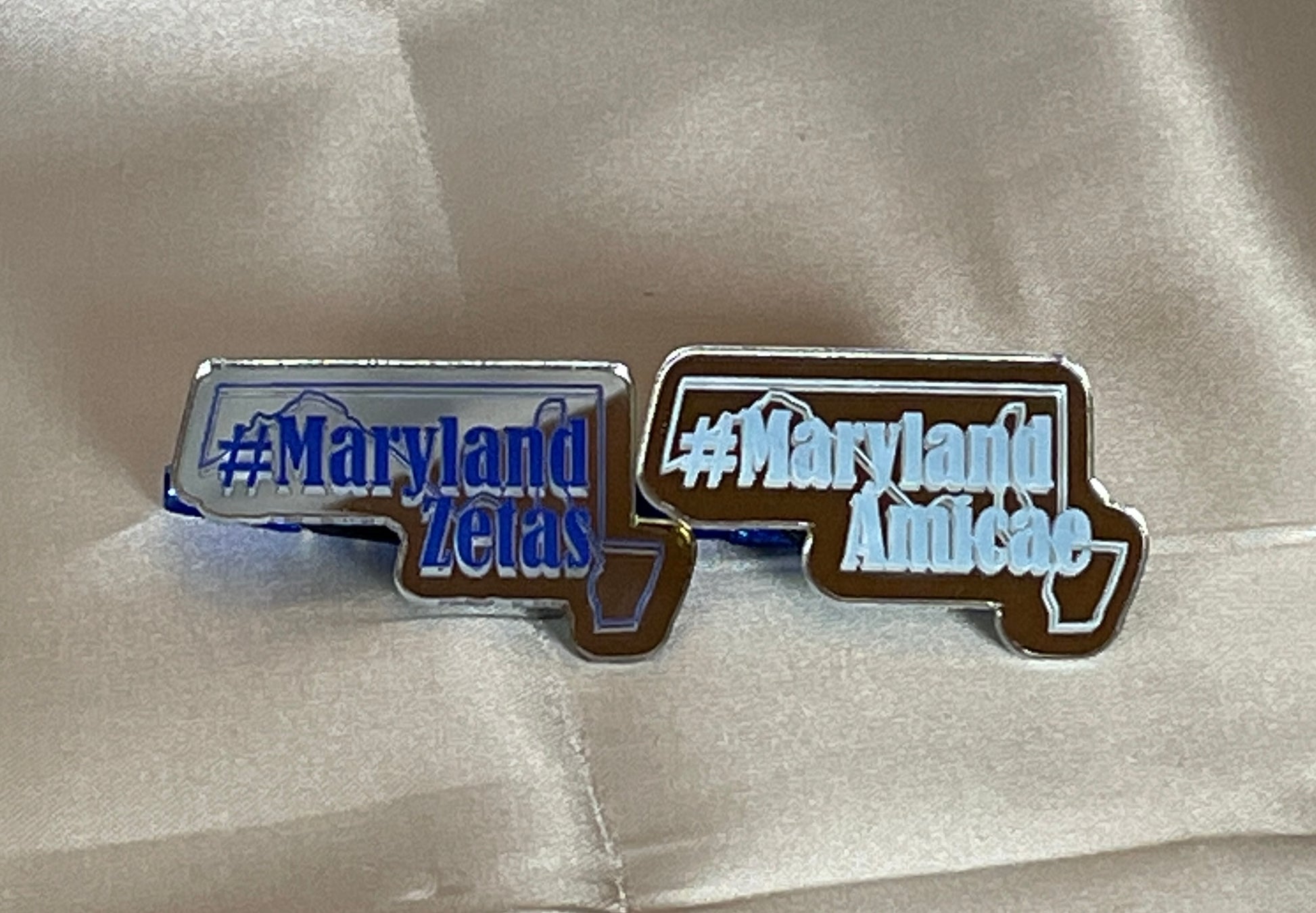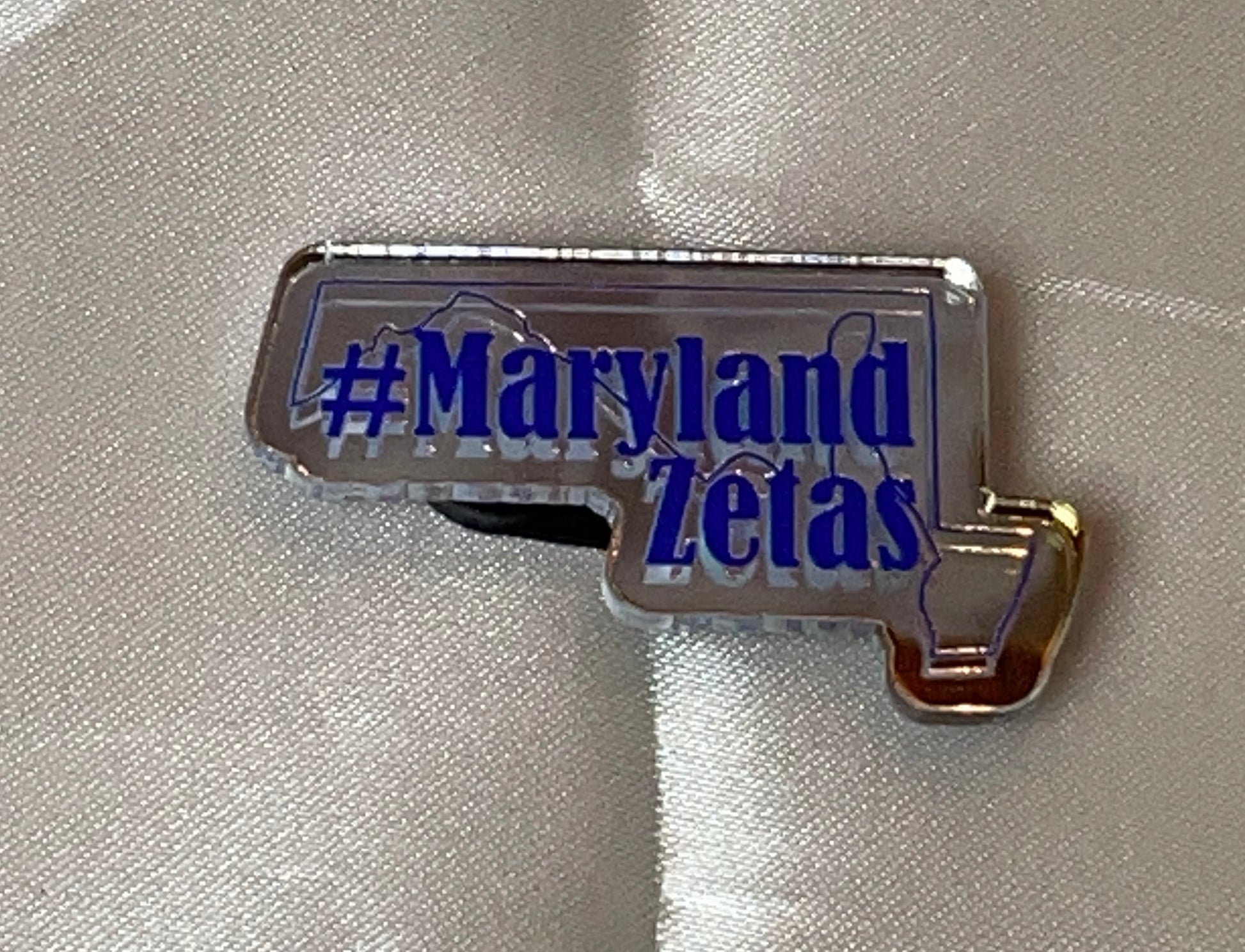 This pin has bling, and sings the state of Maryland. Made of mirrored acrylic, it is cut in the shape of the state, and overlayed with our hashtag Maryland Zetas and Maryland Amicae.
