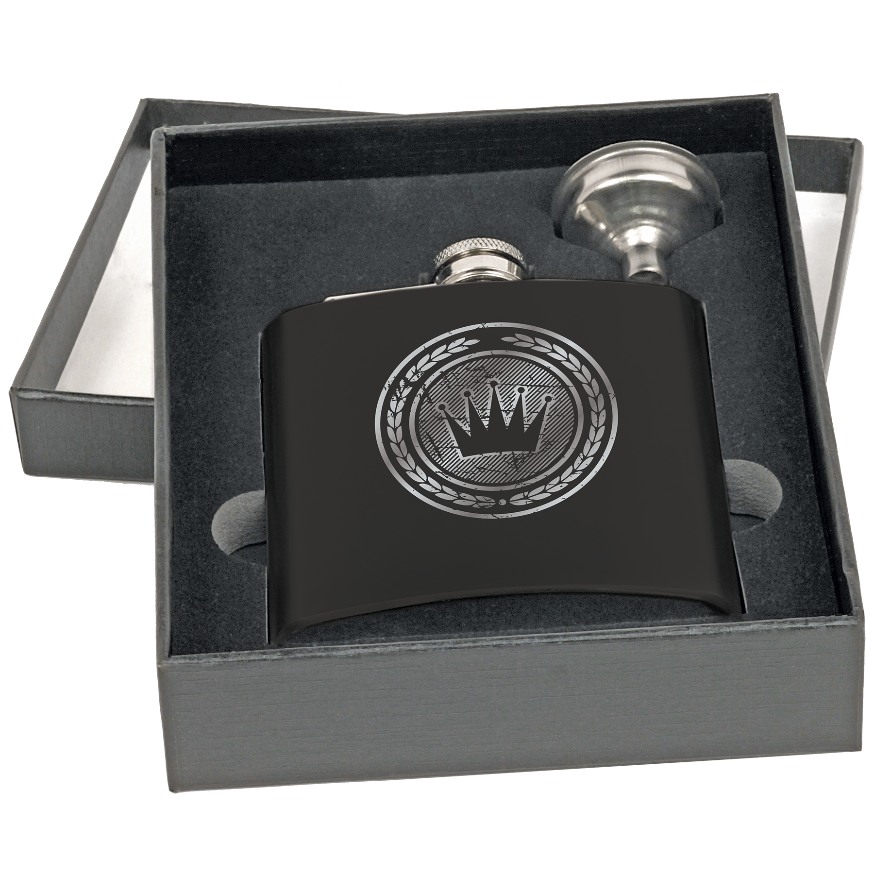 Our Laser Engravable Flask Set with funnel is the perfect canvas for any special occasion. The 6 oz Matte Black flask comes with a funnel for easy filling. They will appreciate your personal touch that is expertly laser engraved for a permanent mark that will never wear away or wash off. The set also features a durable black lid box for safe keeping.