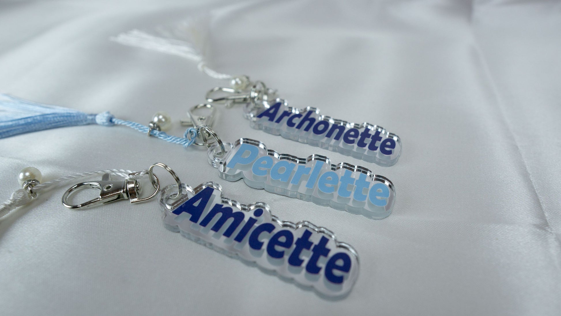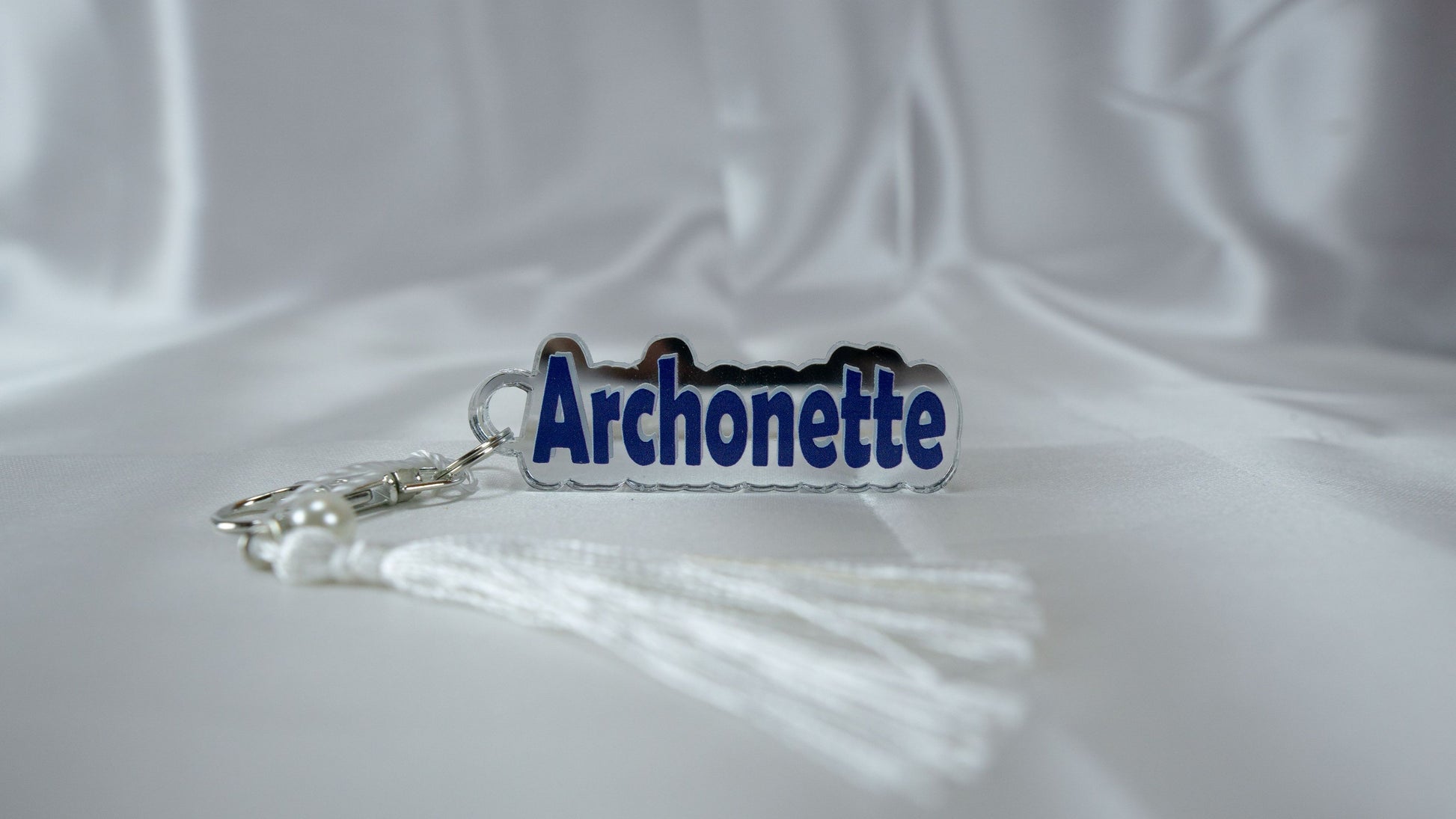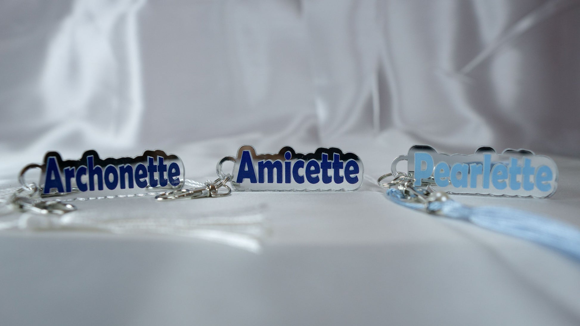 A mirrored acrylic group name charm, is paired with a color-coordinated tassel, and a single pearl crowned with rhinestones. Topped off with a lobster clasp, this unique Zeta Youth Group accessory can add charm to any variety of items.