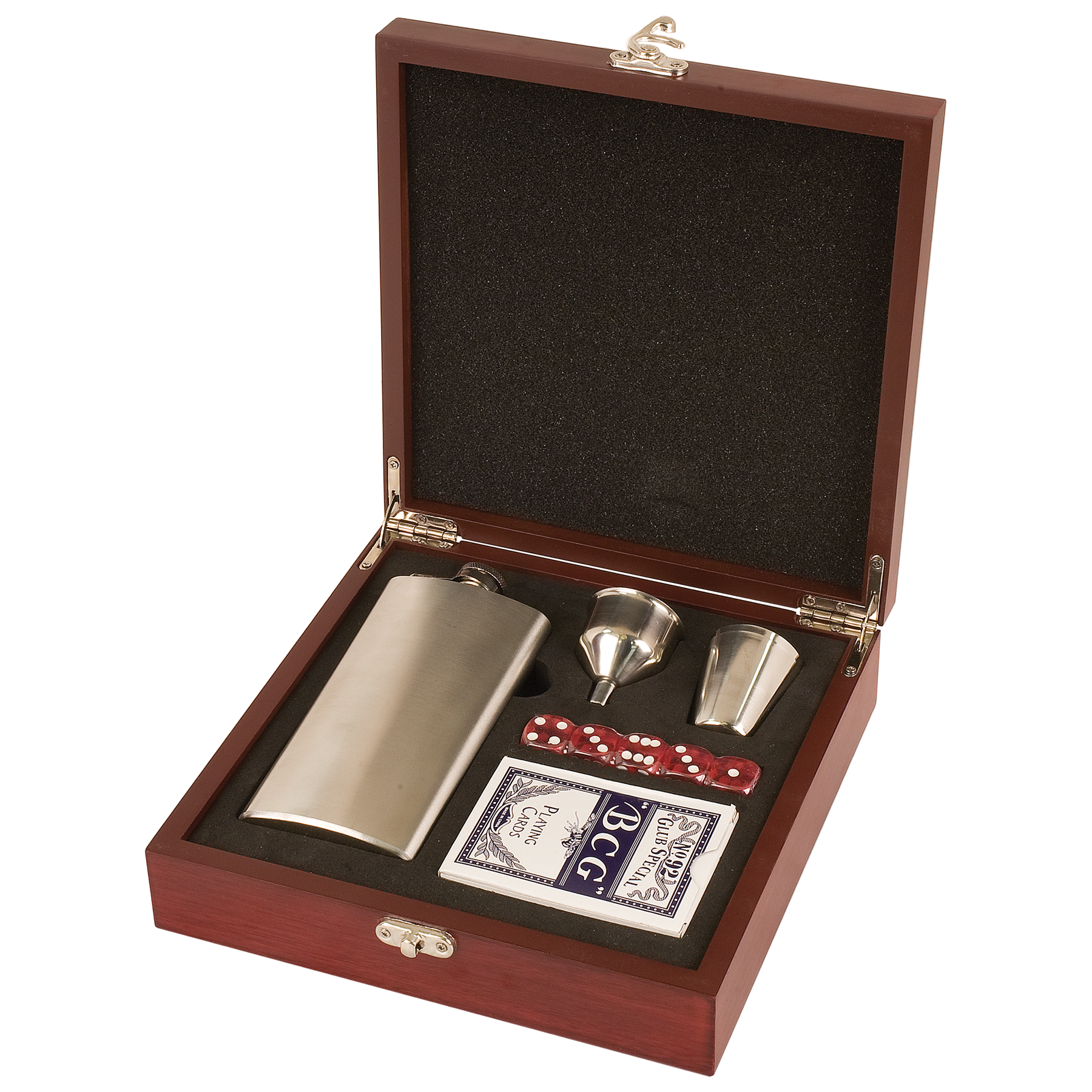 Rosewood Finish flask set comes complete with presentation box, flask, shot glass, funnel, deck of cards and 5 dice. Perfect for housewarming gift and guaranteed to get any party started.