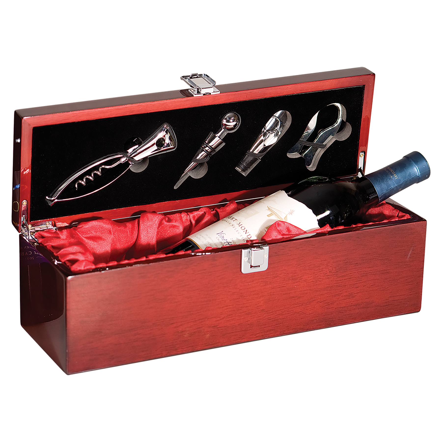 This high class gift set is perfect for any wine lover. Rosewood piano finish presentation box holds 1 wine bottle and is lined with a satin like red liner and comes complete with corkscrew, stopper, decanting pourer and plastic foil cutter.
