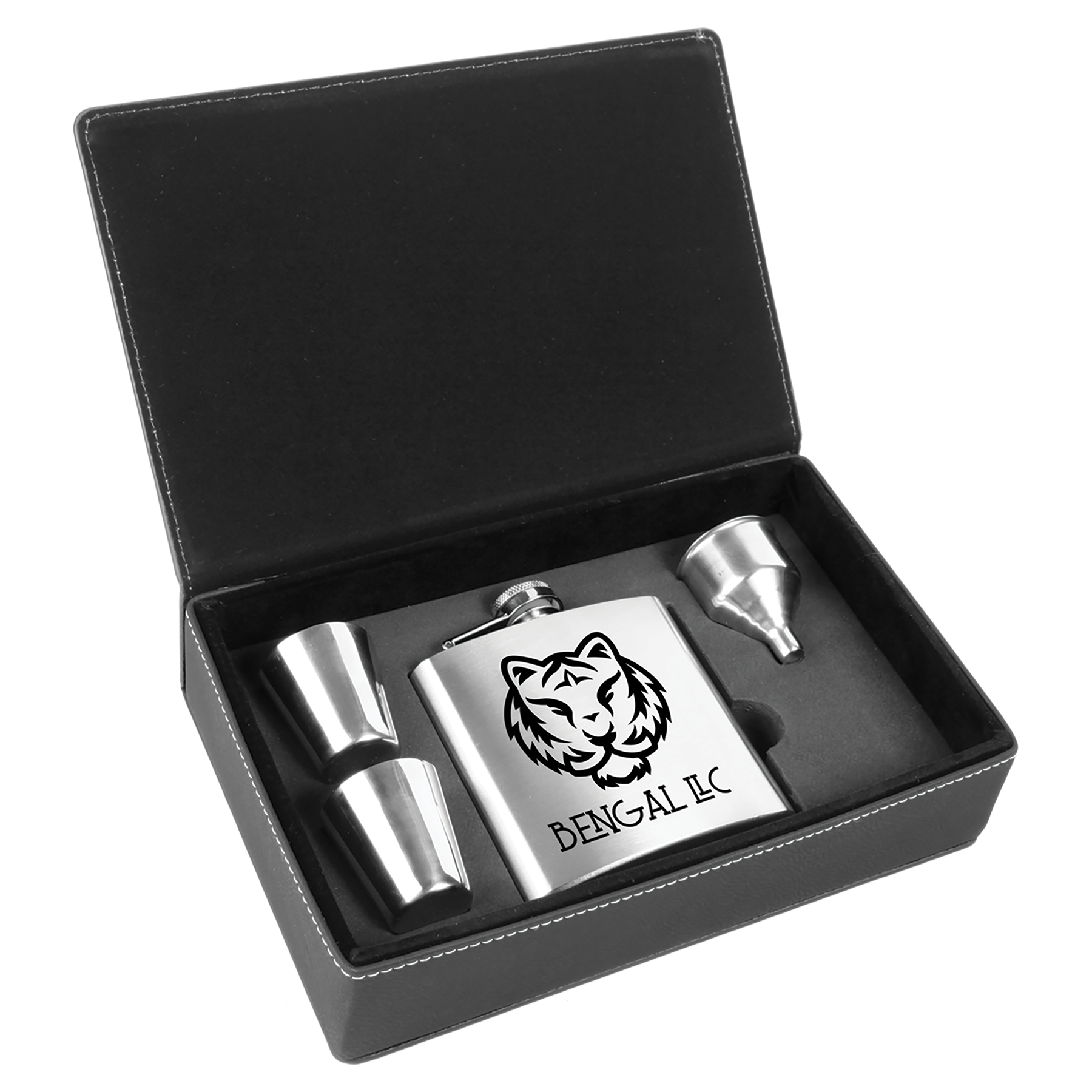 6 oz. Stainless Steel Flask Set in Black/Silver Laserable Leatherette Box