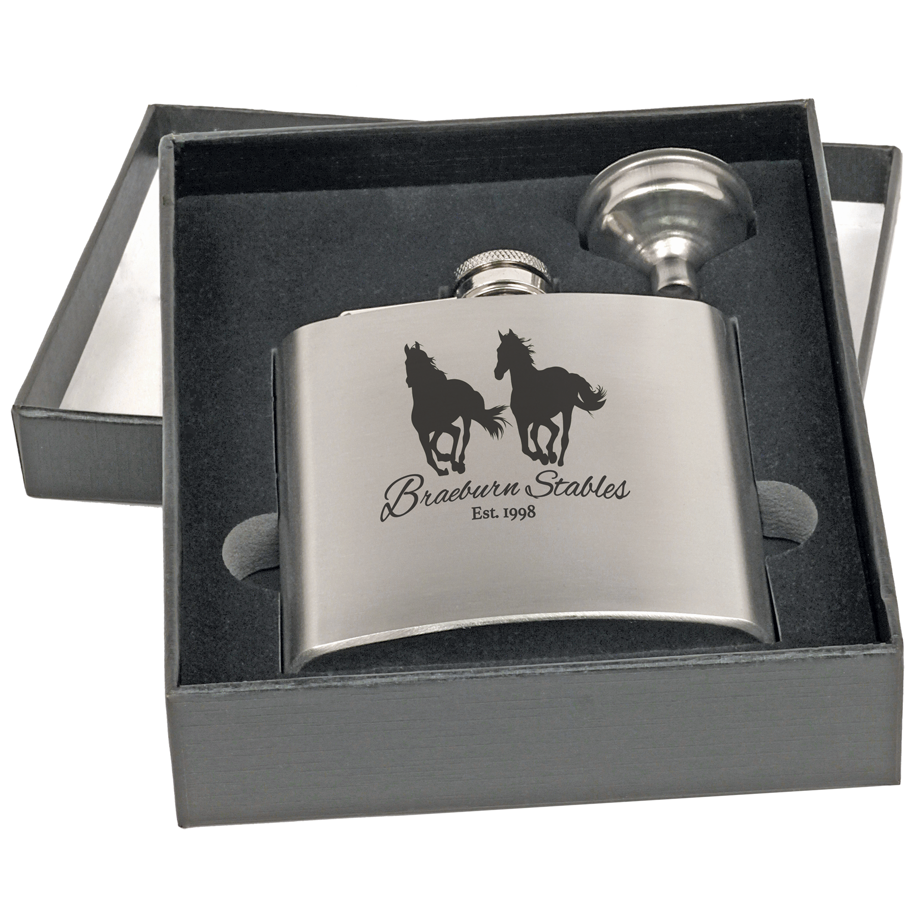 Our Laser Engravable Flask Set with funnel is the perfect canvas for any special occasion. The 6 oz stainless steel flask comes with a funnel for easy filling. They will appreciate your personal touch that is expertly laser engraved for a permanent mark that will never wear away or wash off. The set also features a durable black lid box for safe keeping.