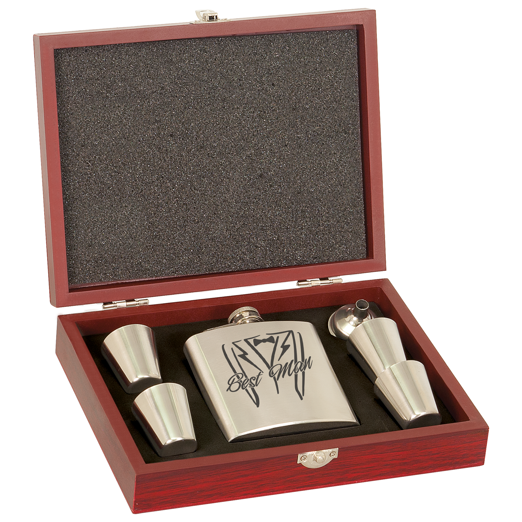 Our Laser Engravable Flask Set with Shot Glasses is the perfect canvas for any special occasion. The 6 oz Stainless Steel flask comes with four shot glasses and a funnel for easy filling. They will appreciate your personal touch that is expertly laser engraved for a permanent mark that will never wear away or wash off. The set also features a beautiful hinged Rosewood box for safe keeping.