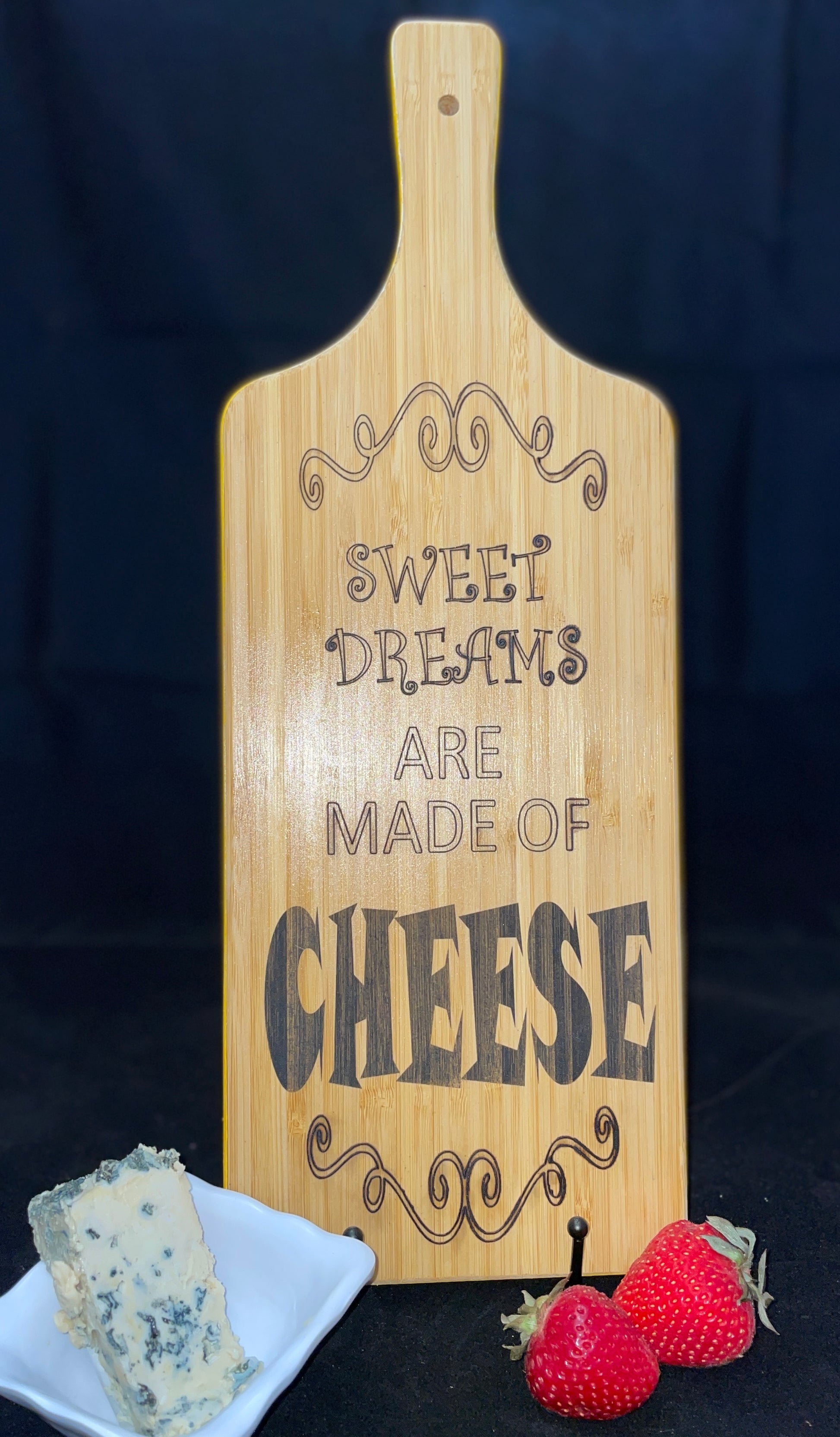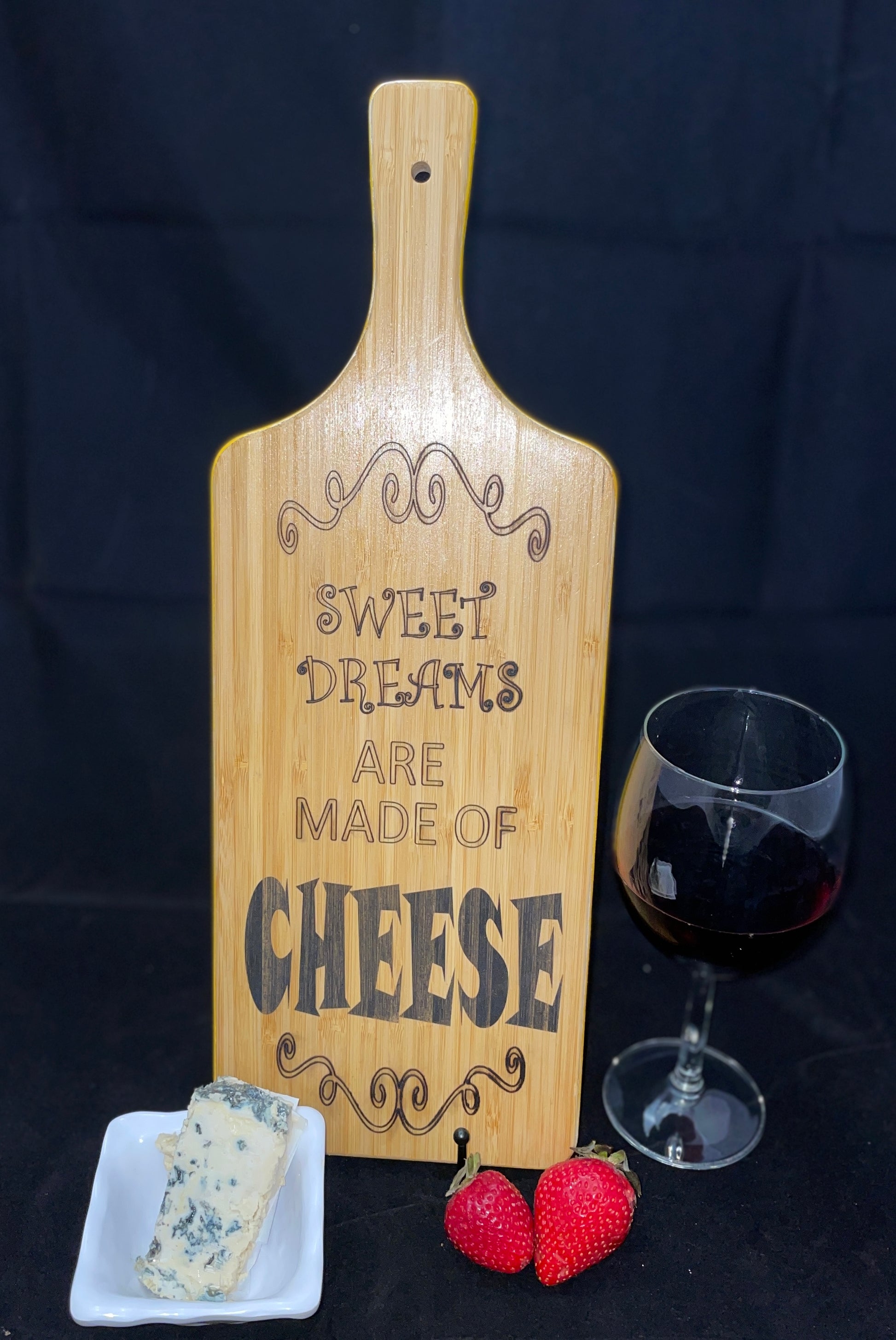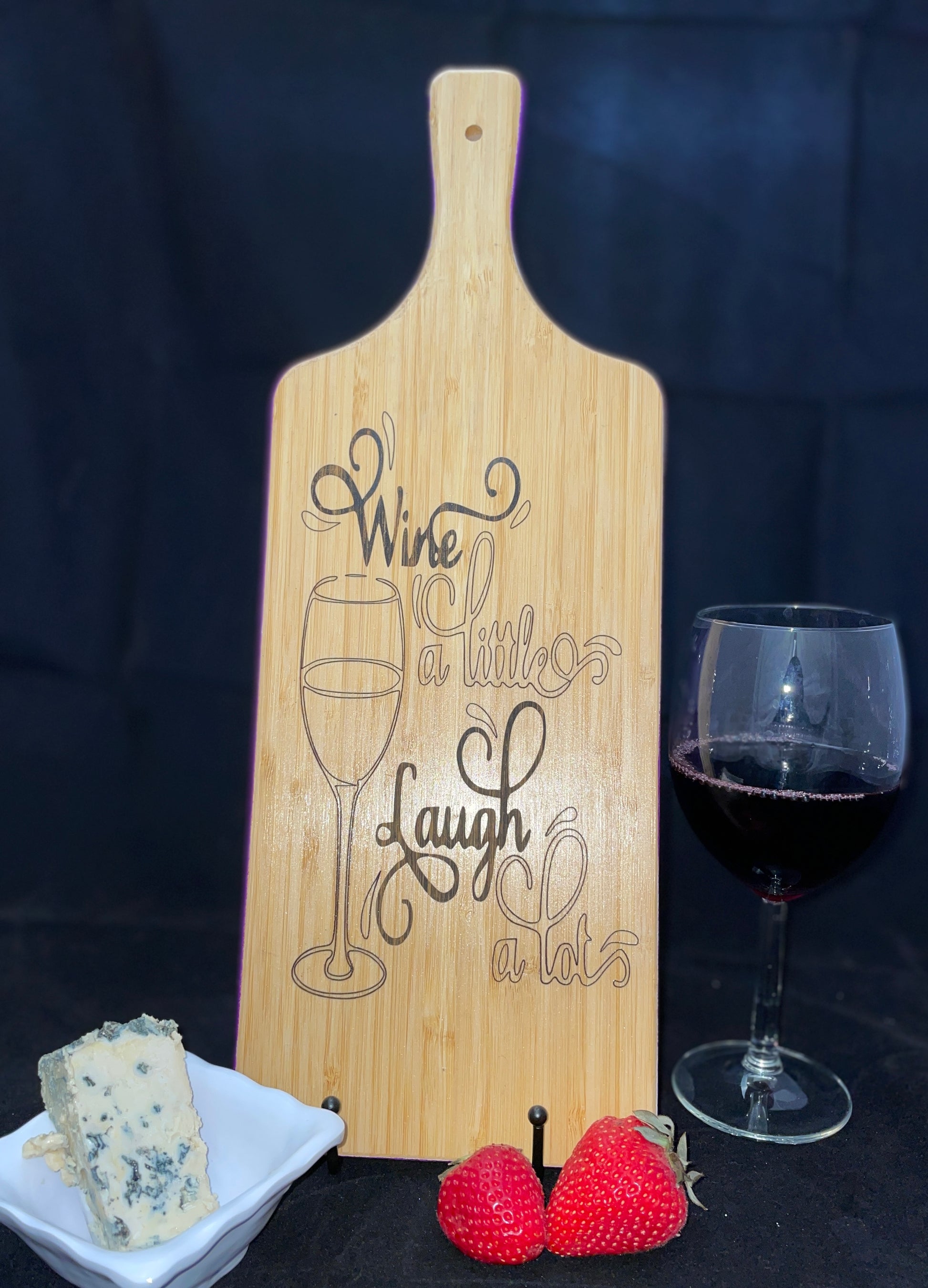 Each 16-inch natural bamboo board is precisely laser printed on one side with a unique design that is sealed with food-grade clear coat for a lifetime of display and use. The blank side comes pre-cured, and serves as handy presentation for charcuterie, cheeses or small treats.