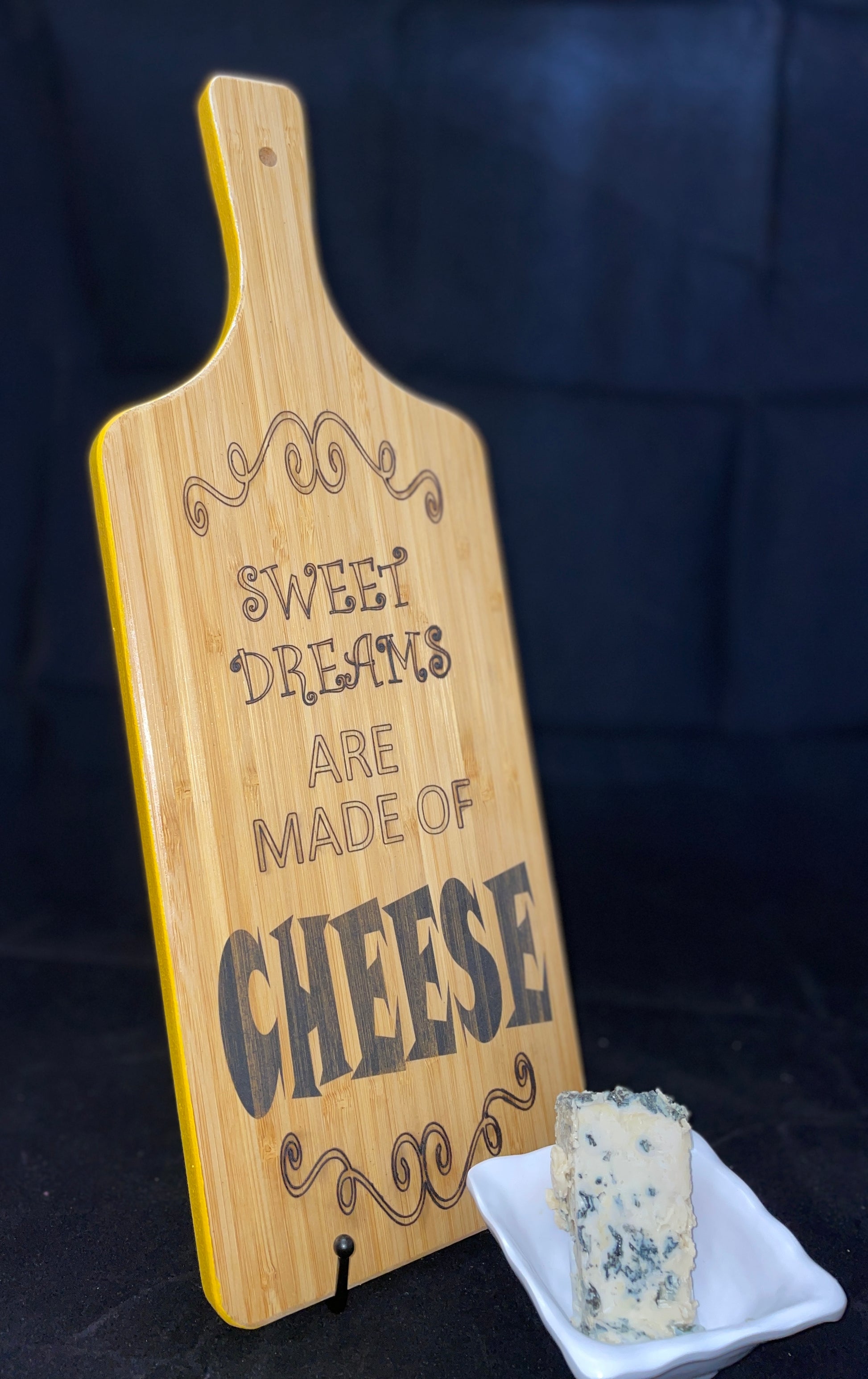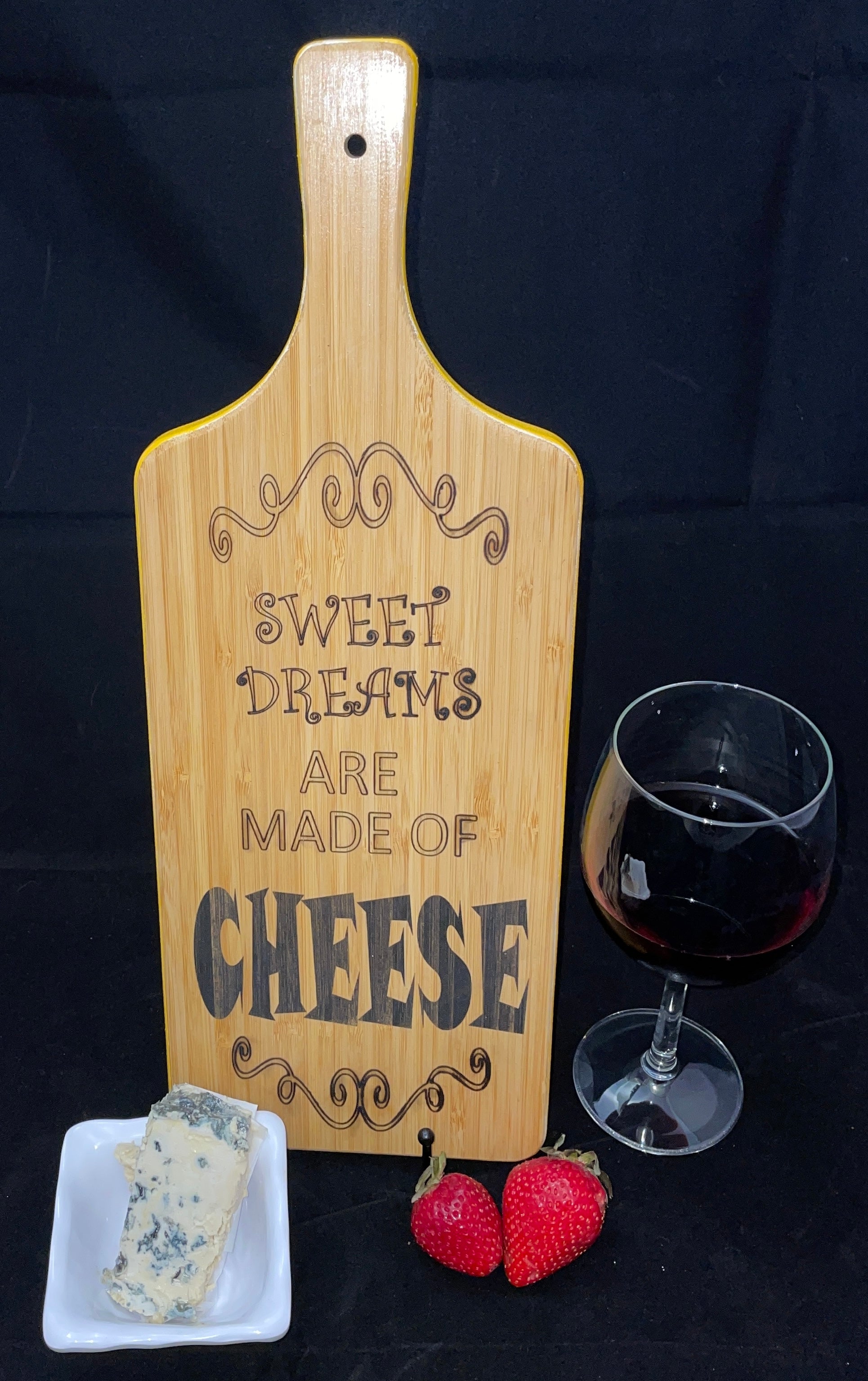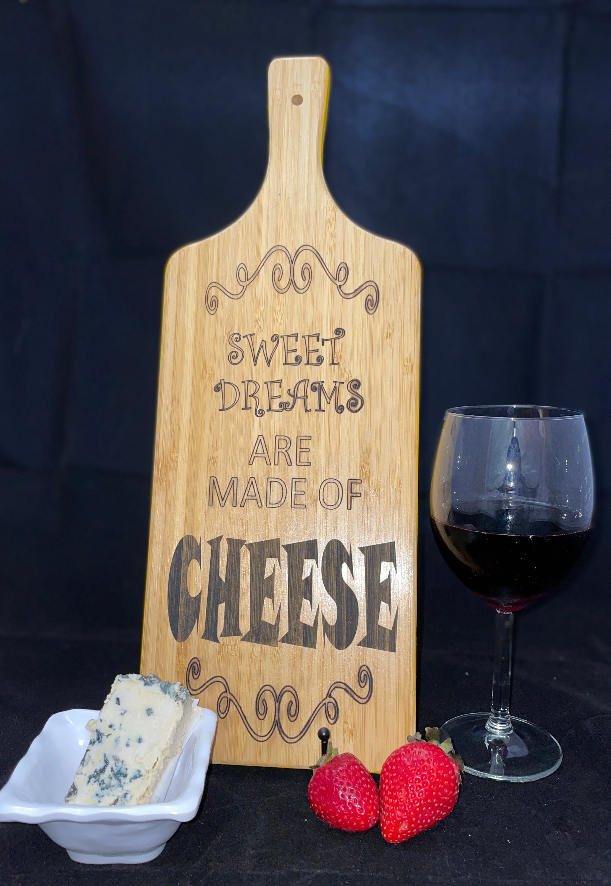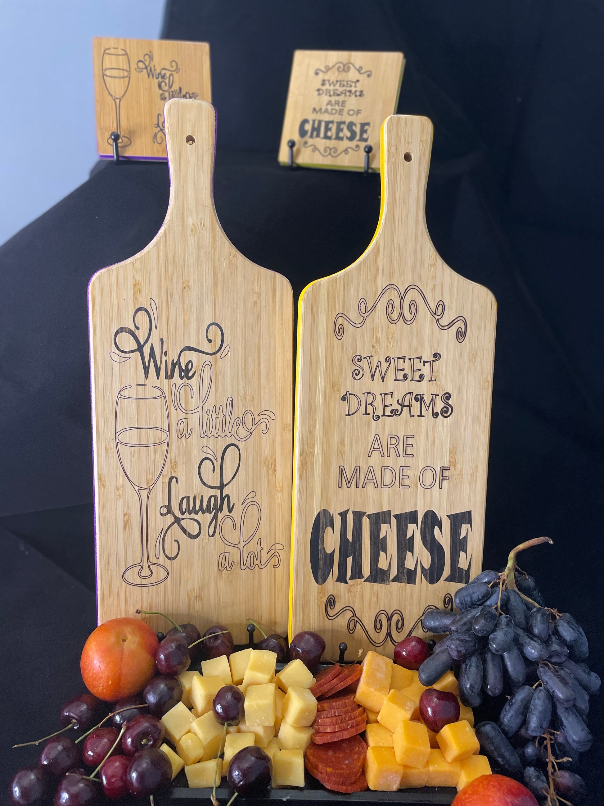 Each 16-inch natural bamboo board is precisely laser printed on one side with a unique design that is sealed with food-grade clear coat for a lifetime of display and use. The blank side comes pre-cured, and serves as handy presentation for charcuterie, cheeses or small treats.