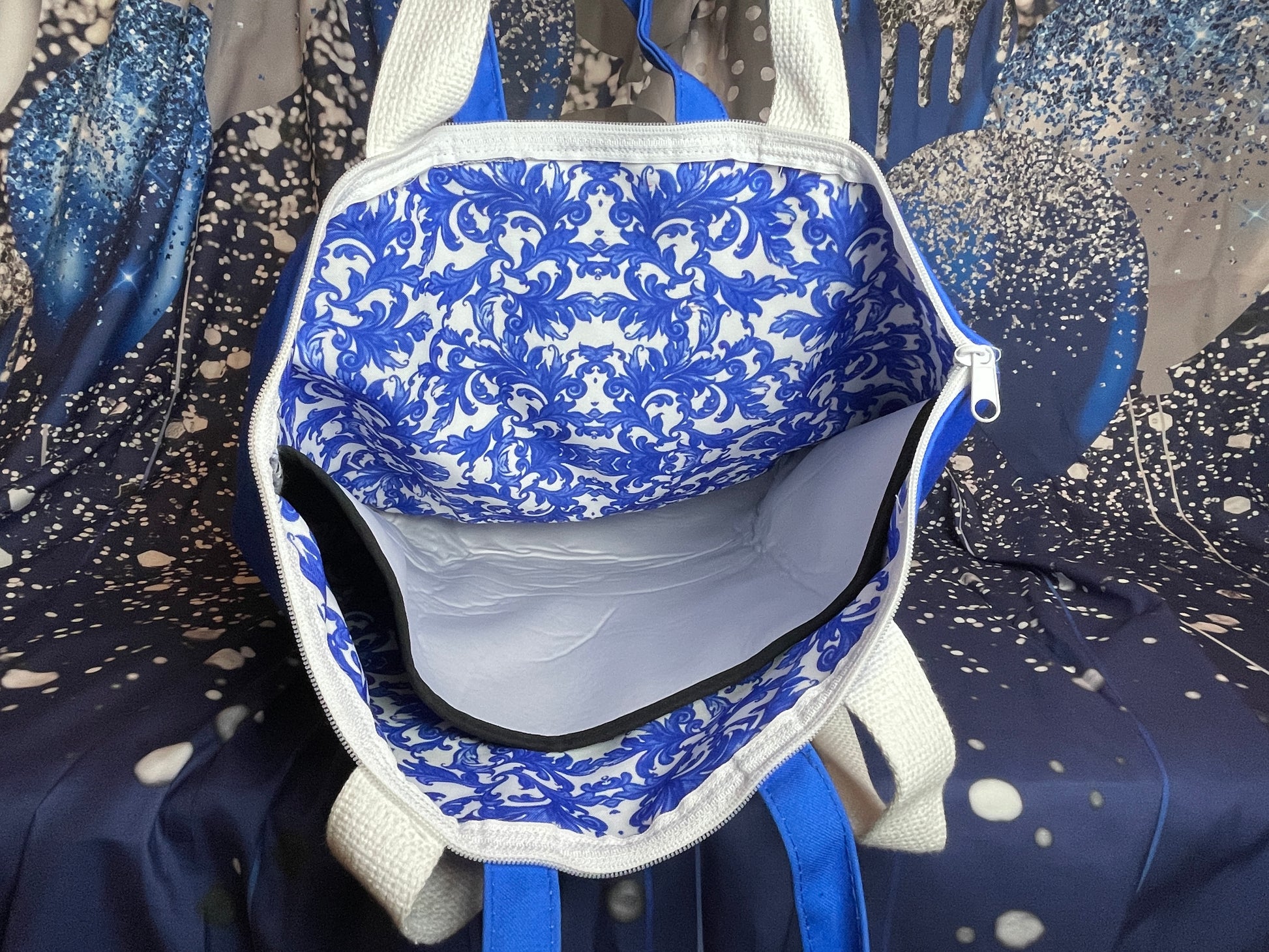 Inside, you'll find beautiful royal blue and white design alongside a sturdy, double-sided Europrene laptop sleeve to keep your computer safe from bumps and bruises. Capped with a zip closure, these bags are functional, durable, and beautiful in every way!