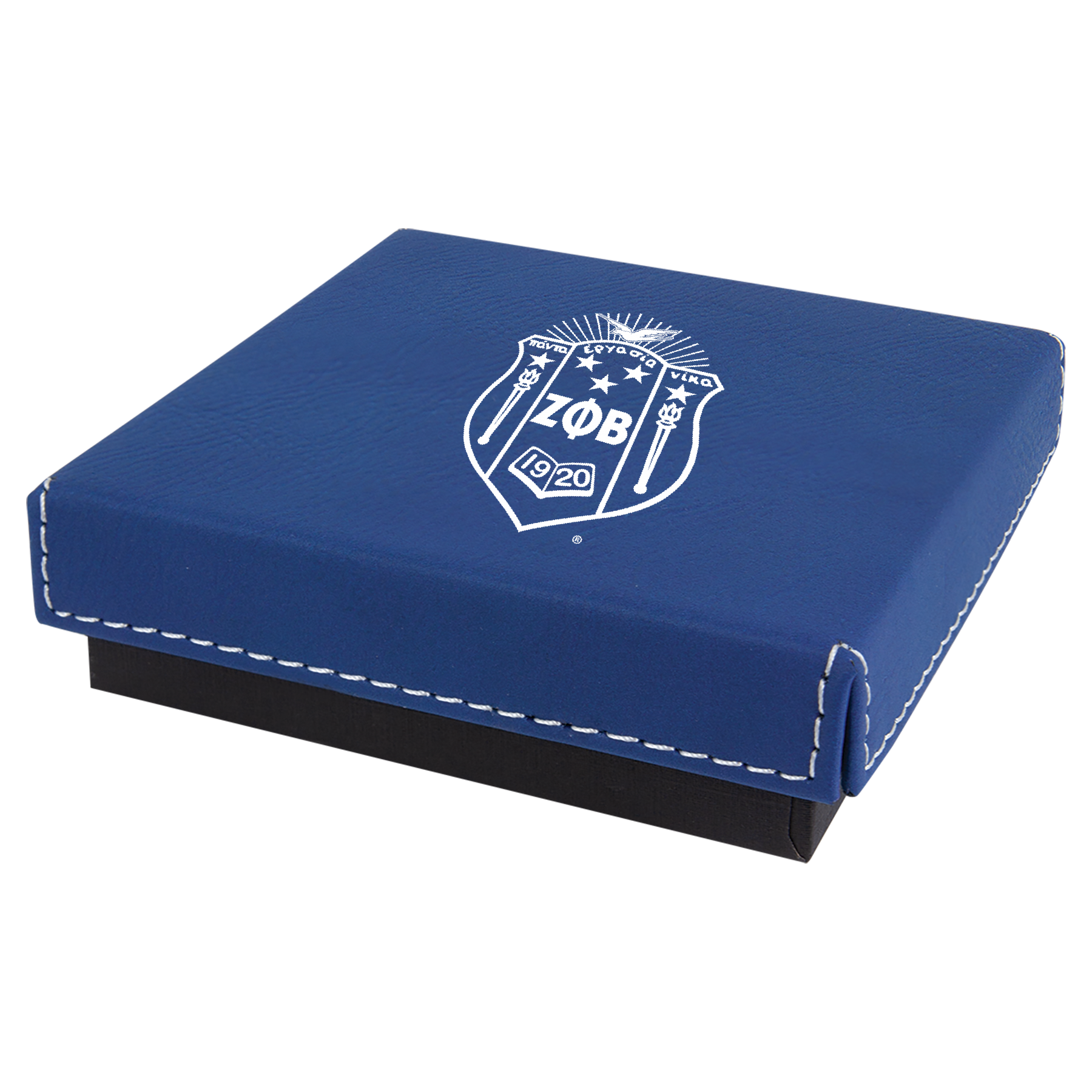 The two-piece box measures 4 x 4 inches and comes with removeable lid. The top features the Zeta shield on a a richly textured, synthetic material that gives the the look and feel of genuine leather.