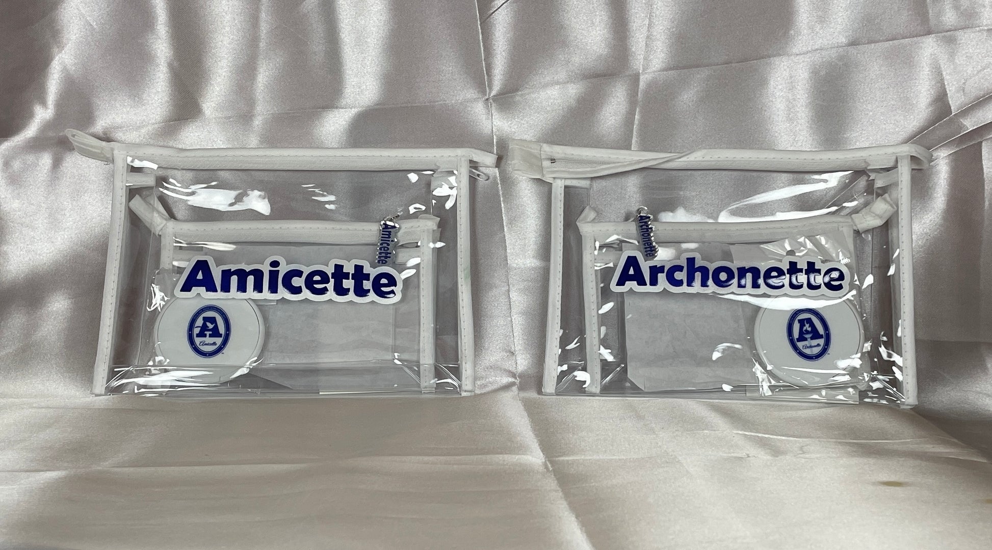 The smaller bag is perfectly sized for nail polish and features a zeta youth group zipper pull. The large bag can easily accommodate cosmetics, and features the youth group name printed on the bag.
