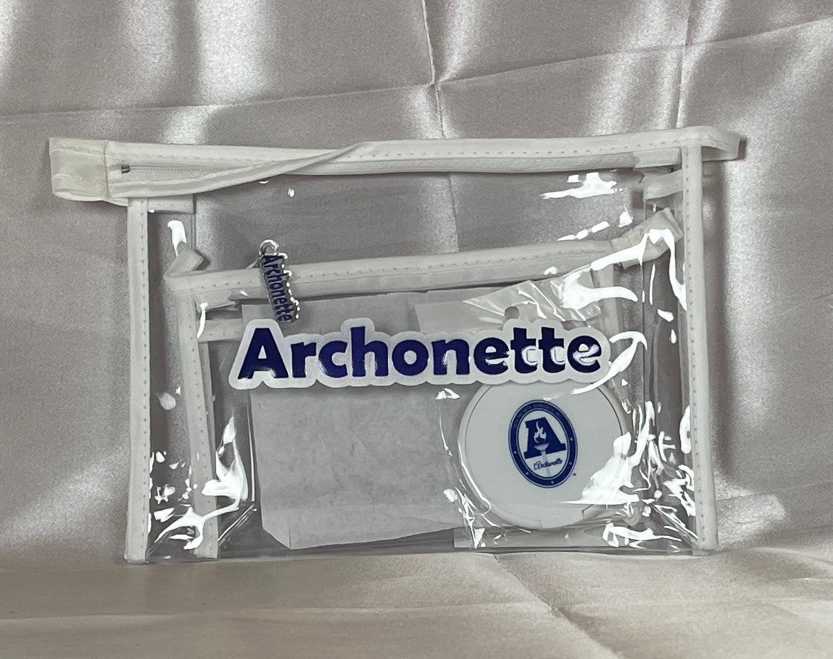 This three piece makup kit groups a small and large makeup bag set and a super cute compact mirror featuring the Zeta Youth Group logo.